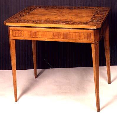 in olive wood and rare essences The sliding table top hides a writing tray and a set of five drawers Sienese art end of the XVIII century. |