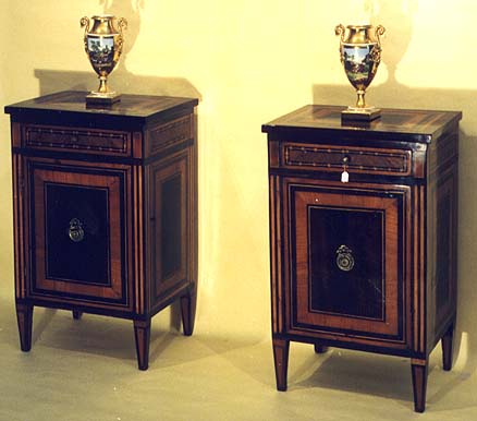 intarsiati in legni pregiati Italia centrale 1780 Misure: cm. 50 x 40 h. cm. 80 Coppia di vasetti in porcellana con miniature dipinte Francia periodo dell'impero napoleonico - 1810 |