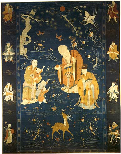 Cinese, presumibilmente arazzo di seta "Kesi" con ricami in filo d'oro d'argento. Fine della dinastia Ch'ing. Sulle fasce laterali: gli Immortali Al centro: il Dio della Longevità tiene nella mano il frutto del P'an-t'ao, albero favoloso che fioriva ogni 3.000 anni ed accanto a lui altri due soggetti, dei bambini ed un cerbiatto. Misure: h. mt. 3,06, larghezza mt. 2,46 |