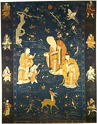 | Chinese fabric, presumably Tapestry of "Kesi" silk embroidered with some silver and gold threads. End of the Ch'ing dinasty. On the lateral bands: the Immortals In the center: the Longevity God holds in his hand the "P'an-t'ao" fruit, fabulous tree blooming every 3.000 years, besides the God two other figures, some young boys and a young stag. Dimensions: height mt. 3,06, width mt. 2,46 |