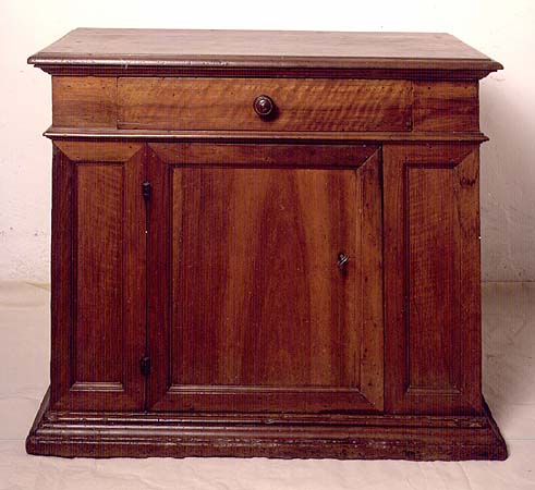 credenza in legno di noce ad un'anta ed un cassetto. Arte italiana di manifattura Toscana della prima metà del secolo XVII. Misure: h. cm. 81, largh. cm. 77, profondità cm. 49 |