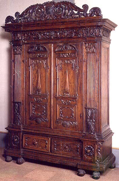 noce a due sportelli decorato da intagli. Pilastri a canna d'organo con capitelli, cappello con stemma al centro del fregio. Imbasamento con cassetti, piedi a cipolla intagliati. Parma, "modello Farnese", XVII sec. Misure: cm. 176 x 61 x h. cm. 274. |