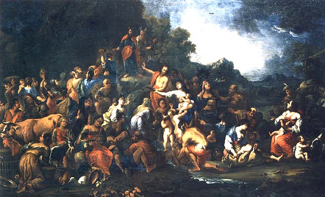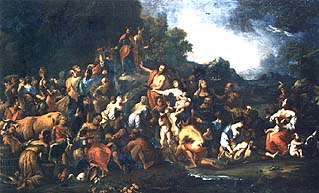CORNELIO DE WAEL (active in Italy from 1610 up to 1667) Moses makes the water springing out of the rocks. Oil on canvas, cm. 80 x 130. Antique carved and gilded frame, cm. 98 x 148. Expertise by Prof. Piero Torriti. |