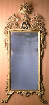 and neoclassical motifs. Decorated cyma with a medallion in the center showing a gilded head on a black background surmounted by a vase with flowers and leaves. Florence, last quarter of the XVIII century. Dimensions: cm. 98 x h. cm. 213. |