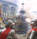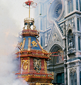 Explosion of the cart: Easter Sunday (april 4th) in Florence, Piazza Duomo The ceremony that gave rise to the modern-day Scoppio del Carro (‘explosion of the cart’) officially became public in 1102, at a time when the Pazzi family enjoyed great fame and prestige, partly as a result of Pazzino’s heroic deeds during the First Crusade (1096). However, the Pazzi family were stripped of all their wealth and privileges, and exiled from Florence, after their aborted attempt to overthrow the Medici in 1478. From that moment on, the Signoria took over responsibility for the preparation and celebration of the ritual explosion of the cart. The ritual has not altered over the years. The richly decorated cart, which dates to the 18th century, is hauled by gaily bedecked oxen from Porta al Prato to the cathedral square. A wire is run from the choir of the cathedral and fixed to the centre of the cart. In the meantime a procession of clergy leaves the Church of the Santissimi Apostoli and goes to the Baptistery for a religious function. At midday a dove-shaped rocket is released inside the cathedral; it slides along the wire, leaving a trail of smoke along the length of the nave. When it reaches the cart, it sets off a cluster of crackers, and then slides back to its point of departure. After a few moments, hundreds of multicoloured fireworks positioned on the cart go off, accompanied by cracks and whistles. A Catherine wheel on top lights up and starts spinning, ending with a loud bang and opening up to form the petals of a lily. Then four small gonfalons appear, bearing the emblems of Florence, of the old Pazzi family, of the Wool Merchants’ Guild and currently, as a sign of peace in the world, of the UN. When: the cart starts from via Il Prato at 9 am. At 10 am the procession of clergy starts from the Church of SS. Apostoli. Explosion of the Cart at 11 am.