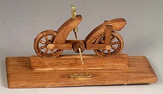 This is the last drawing by Leonardo that has been found, and not the least surprising. The drawing illustrates a bicycle without a rotating handle-bar. The transmission system from the rear wheel includes toothed gears and a circular leather strap. Dimension: cm. 14x6x5