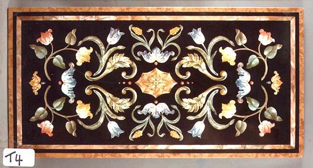 The design is transferred graphically on to a marble slab, which is then engraved to a variable depth, maximum being 5 mm. The design is then inlaid with a mixture made of crushed marble, resin and colour; once it is dry the surface is smoothed and then polished.